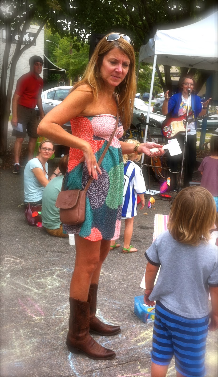 I was on my way to the new olive oil store on Devine Street when I noticed a pleasant sort of commotion nearby. The children's store--K.D.'s Treehouse--was having a fall festival. The band Lunch Money was playing merrily, and small humans were jumping inside an inflatable house that reminds one of the padded walls rumored to be in mental institutions. I saw any number of fashionable people there, including this trim woman--who was managing to straddle the seasons with cowboy boots and a sundress in autumn colours. Well done, I thought for a late September Saturday with temperatures approaching 90 degrees.